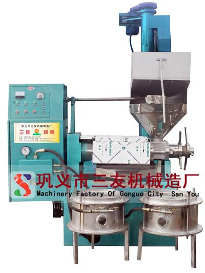 榨油機(jī)工作時(shí)主電機(jī)傳來(lái)的動(dòng)力經(jīng)減速機(jī)傳給主軸,裝在主軸上的榨螺隨著旋轉(zhuǎn),將螺旋間的油料不斷向前推進(jìn)。榨油機(jī)由于榨鏜和榨螺間的空隙逐漸縮小,油料的密度增加,因而壓力逐漸增固。在壓榨過(guò)程中油料顆粒之間,油料與零件之間發(fā)生摩擦,產(chǎn)生了熱量,這樣就構(gòu)成了榨油工藝的壓力、熱量?jī)纱笠兀茐挠土霞?xì)胞組織,油從油線中溢出,餅則從榨錐部與出餅口之間被推出,當(dāng)溢出的油通過(guò)油盤流入濾油器上面時(shí),桶內(nèi)形成負(fù)壓,油通過(guò)濾布,被推進(jìn)濾油桶內(nèi),而油渣被隔離在濾布上面,這時(shí)的就是好的油液。